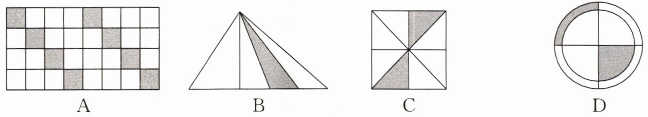 2. 下面图形( )的阴影部分面积不是整个图形面积的$\frac{1}{4}$。