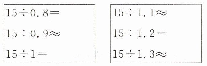 15÷0.8=18.75 15÷0.9≈16.67 15÷1=15 15÷1.1≈13.64 15÷1.2=12.5 15÷1.3≈11.54 我发现:被除数(不为 0)不变,当除数大于 0 小于 1 时,商(大于)被除数;当除数大于 1 时,商(小于)被除数;当除数等于 1 时,商(等于)被除数。