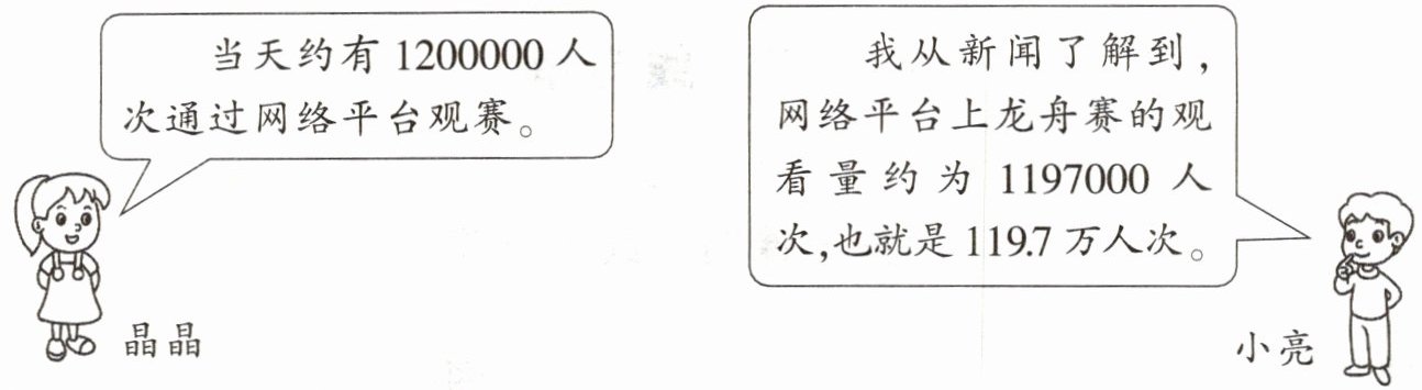 (1) 晶晶和小亮都了解到在网络平台上观看龙舟赛的人次,同一个信息为什么会出现“1200000”和“1197000”两种不同的数据呢?说说你的看法。