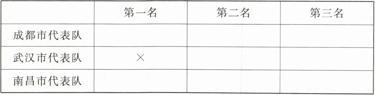 (2)南昌市代表队为第一名,武汉市代表队为第二名,成都市代表队为第三名。