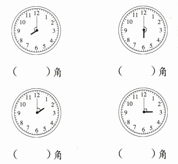 (5)观察下列钟面,分别写出时针和分针所形成的角的名称。