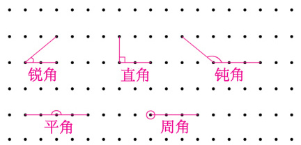 3. 在下面的点子图上分别画出一个锐角、直角、钝角、平角和周角,再把它们按角的大小顺序排一排。