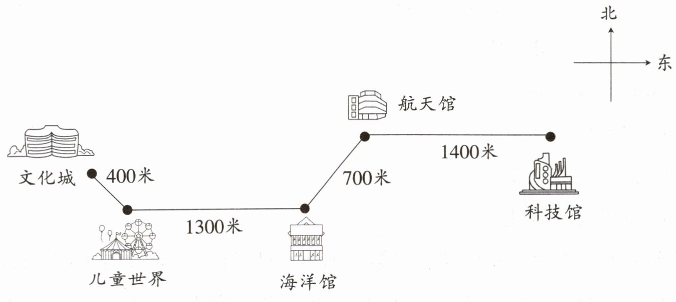 (1)从文化城出发到科技馆:从文化城向东南走400米到儿童世界,然后向东走1300米到海洋馆,再向东北走700米到航天馆,最后向东走1400米到科技馆。从科技馆返回到文化城:从科技馆向西走1400米到达航天馆,然后向西南走700米到海洋馆,再向西走1300米到儿童世界,最后向西北走400米到文化城。