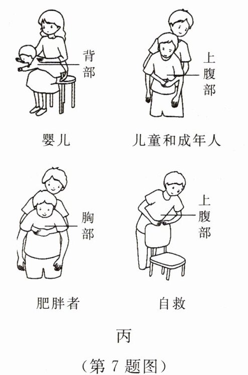 (4) 当采用海姆利希急救法施救时,应注意对不同人群冲击的部位不同,并且尽量不造成二次伤害。据图丙分析,对儿童和成年人进行急救时,应快速向内、向上冲击其上腹部。冲击会使被救者的膈顶部上升→胸腔容积______(填“扩大”或“缩小”)→肺内气压______(填“降低”或“升高”)→肺内气体推动异物向外移动。重复上述操作,直至异物排出。