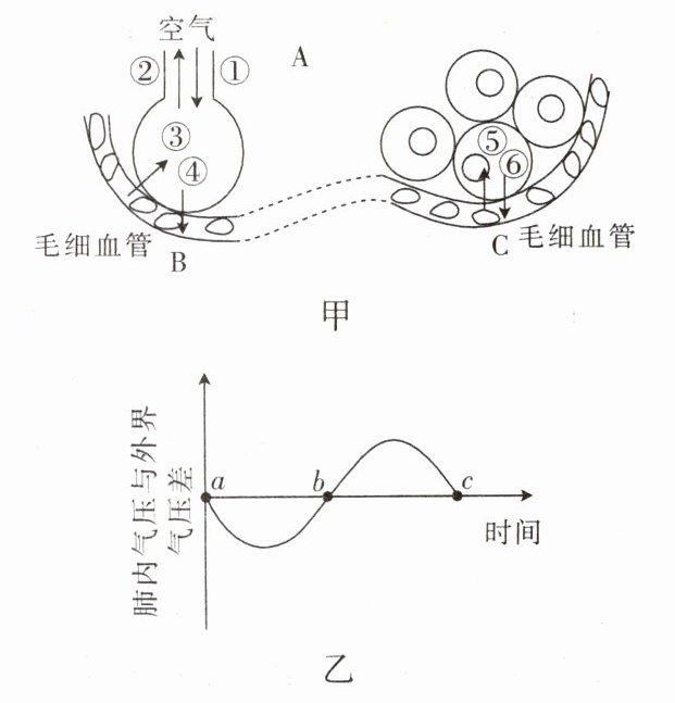 材料一 图甲是人体内气体交换过程的示意图,A、B、C分别代表呼吸的不同过程。图乙是呼吸过程中肺内气压变化的示意图。