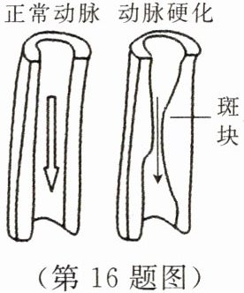 16. 动脉粥样硬化是缺血性心血管疾病的主要生理基础,可服用他汀类药物治疗。该类药物具有明显的降脂作用。下图为正常人和动脉粥样硬化患者的动脉示意图,下列相关叙述错误的是( )