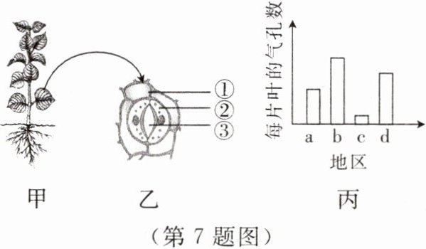 (3)图丙表示同一种植物在不同地区由于受降水量影响,叶片气孔数出现差异,其中______地区降水量最大,______地区降水量最小。