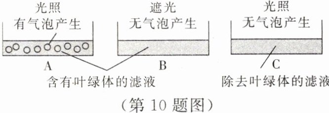 10. 科学家为探究光合作用的奥秘,采集树叶做图示实验,请完成下列习题。