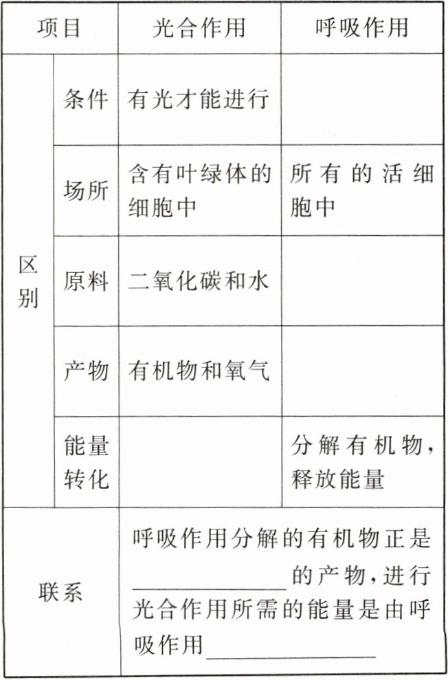 区别:条件:有光、无光都能进行;原料:有机物和氧气;产物:二氧化碳和水;能量转化:制造有机物,贮存能量;联系:呼吸作用分解的有机物正是光合作用的产物,进行光合作用所需的能量是由呼吸作用释放出来的