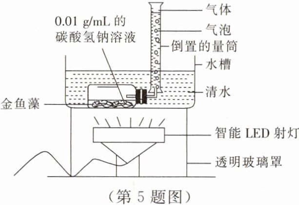 5. 生物学兴趣小组的同学设计了下图所示实验装置(注:智能 LED 射灯可调节亮度;碳酸氢钠溶液可以释放二氧化碳)来探究光合作用产生氧气。下列有关该装置的说法,正确的是( )