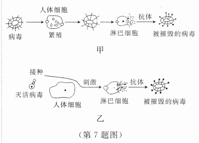 7. 为了有效阻止传染病的传播,我国大力推进各种疫苗的预防接种。某种灭活疫苗的工作原理见下面抗原刺激人体淋巴细胞产生抗体的示意图,请分析并完成下列习题。