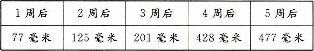 (2)第一周:77-20=52(毫米)第二周:125-77=48(毫米)第三周:201-125=76(毫米)第四周:428-201=227(毫米)第五周:477-428=49(毫米)答:第四周生长得最快,生长了227毫米。