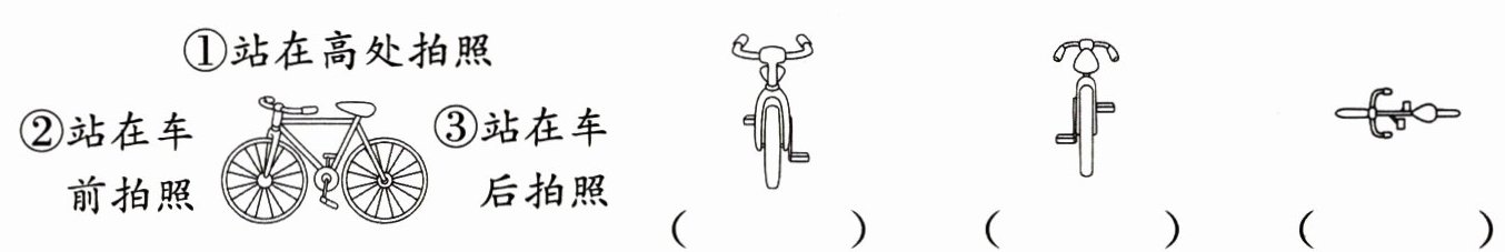 1. 下面的三张照片分别是在自行车的哪个位置拍到的?请在括号里标上序号。
