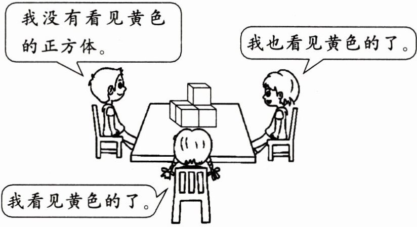 解:从图中可以看出,左边的小朋友说没有看见黄色正方体,说明黄色正方体不在他能看到的这一面;右边的小朋友说看见了黄色正方体,说明黄色正方体在他能看到的这一面;前面的小朋友说看见了黄色正方体,结合右边小朋友能看到,所以黄色正方体是最上面的那个。
