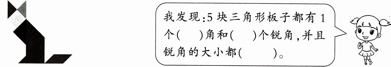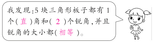 我发现:5 块三角形板子都有 1 个( )角和( )个锐角,并且锐角的大小都( )。
