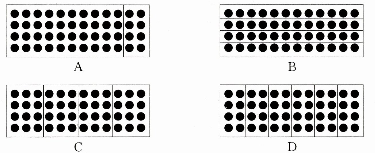 1.点子图能表示出计算过程。右面是欢欢计算12×4的计算过程,下面的点子图能正确反映其计算过程的是( A )。