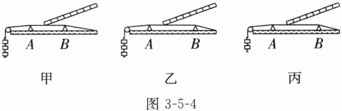 5. 为了研究琴弦发出声音音调的高低与哪些因素有关,小华将一根琴弦的一端固定在桌子上,另一端绕过桌边的小滑轮,通过挂上不同数量的钩码改变琴弦的松紧程度。他先挂上三个钩码,并用 A、B 两个三角形柱状小木块将弦支起,如图 3-5-4 甲所示。他用塑料尺弹拨弦的中部,听到弦发出的声音音调较高;然后他增大 A、B 间的距离,如图 3-5-4 乙所示,拨动琴弦,听到的声音音调比图甲中的低;最后他减少琴弦一端的钩码数量,如图 3-5-4 丙所示,拨动琴弦,听到的声音音调又比图乙中的低。请根据实验现象,归纳得出初步结论。