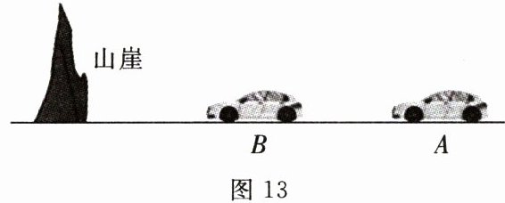 17. 如图 13 所示,在笔直公路上行驶的汽车正前方有一座山崖,汽车以 20 m/s 的速度向前行驶时,在 A 处鸣笛,2 s 后汽车司机在 B 处听到鸣笛的回声。已知声音在空气中的传播速度为 340 m/s。求: