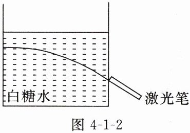 6. 小明在做“光在液体中的传播”实验时,在玻璃缸内配制了白糖水,静置一段时间后,用一束激光斜向上射入白糖水中,发现白糖水中的光线不是一条直线,而是一条曲线,如图4-1-2所示。其中的原因是