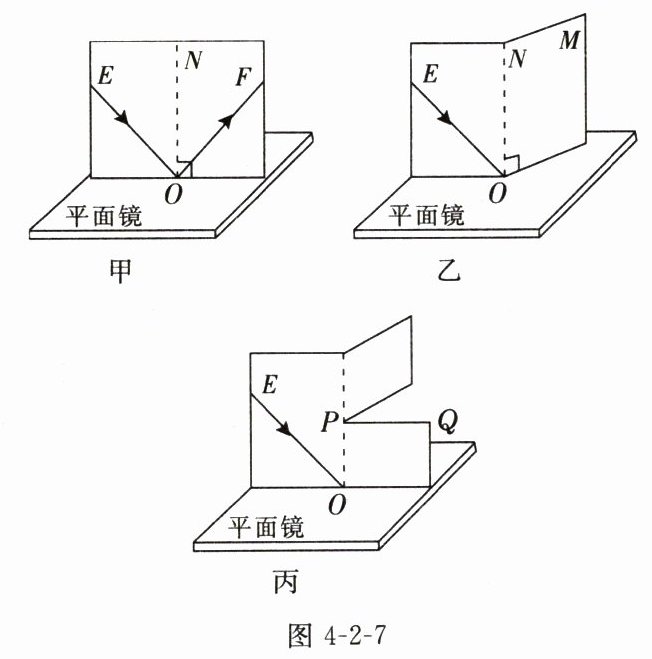 (2)小李让一束光$EO$贴着纸板射到平面镜上,在纸板上会看到反射光线$OF$,然后他将纸板绕$ON$向后折,如图乙所示,在$NOM$面上看不到反射光线,此时,反射光线