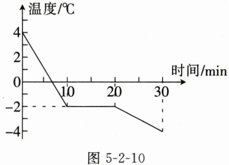 13. 小明猜想:水中加入别的物质后,可能会对水的凝固点产生影响。为了验证这一猜想,他将一些盐放入水中,并用容器盛好盐水放入冰箱,研究盐水的凝固过程。每隔一段时间,小明就观察盐水的状态,测出温度,并将凝固过程记录的温度数据画成了凝固图像,如图 5-2-10 所示。