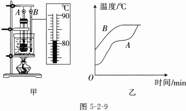 ℃。(4)图 5-2-9 乙是 A、B 温度计的温度随时间变化的图像。小明观察时发现,试管内出现液体时 A 的示数就不再升高,当固体全部变成液体后温度再升高。此现象说明该固体是