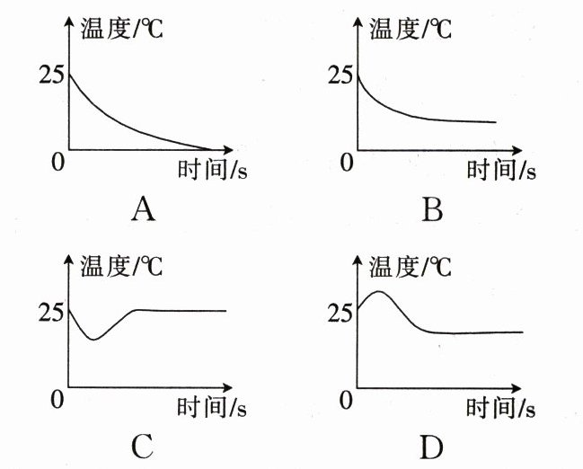 7. 温度计的初始示值为$25^{\circ}C$,小明用它测量敞口瓶中酒精的温度,他将温度计取出后读数。下列选项中能正确反映温度计示数随时间变化的图像的是(