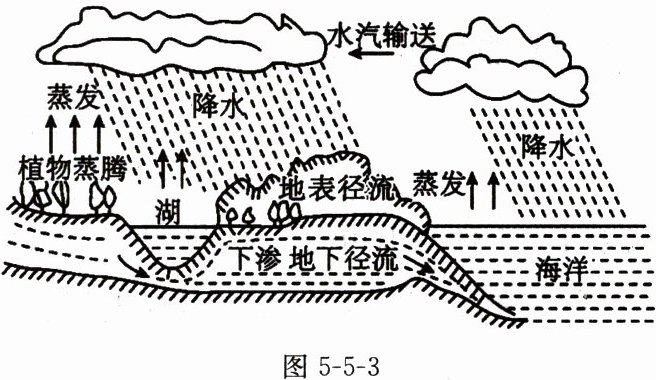 5. 图 5-5-3 是自然界中水循环的示意图。请你填写下列自然界中水的物态变化。