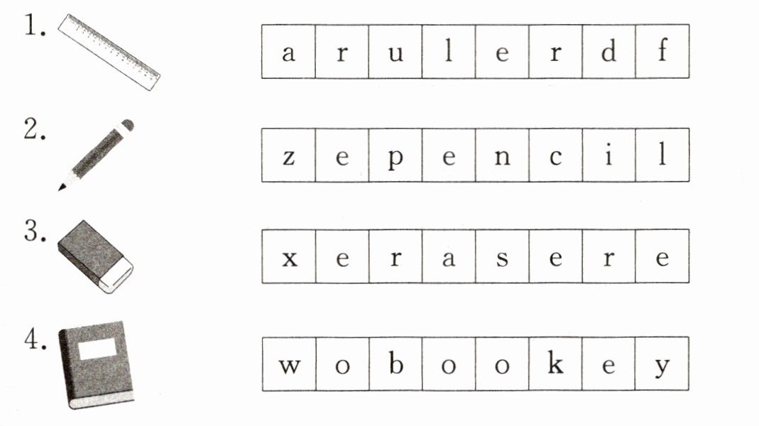 三、下面是小丽课上用到的学习用品。请根据图片提示,在字母框中圈出正确的物品的单词。