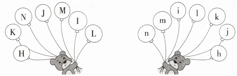 四、Sam要给下面的气球涂色。请根据气球上的字母,将大小写对应的气球涂上相同的颜色,并将字母大小写按字母表的顺序写下来。