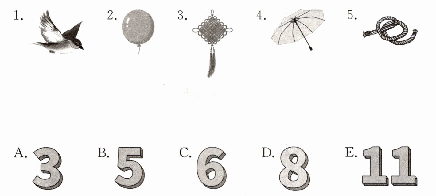二、在去写生的路上,同学们兴奋地聊着天。听句子,将事物与对应的数量连线。