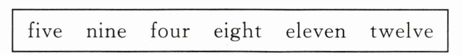 1. five 2. eight 3. nine 4. eleven 5. four 6. twelve