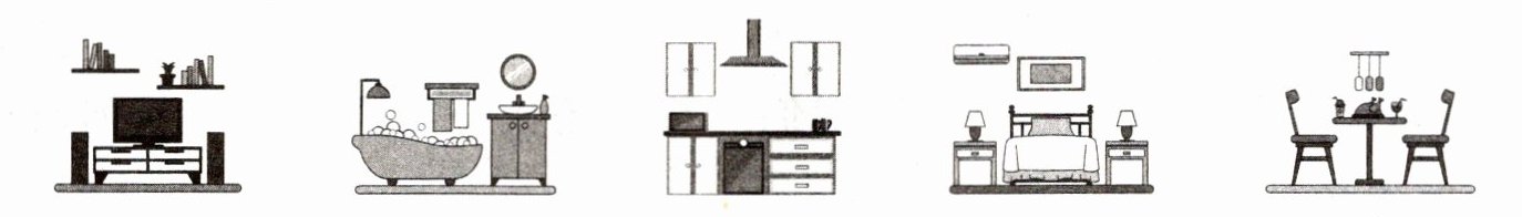 一、Amy 家的房子有各种家庭功能区域。听单词,用数字 1—5 给下列图片排序。