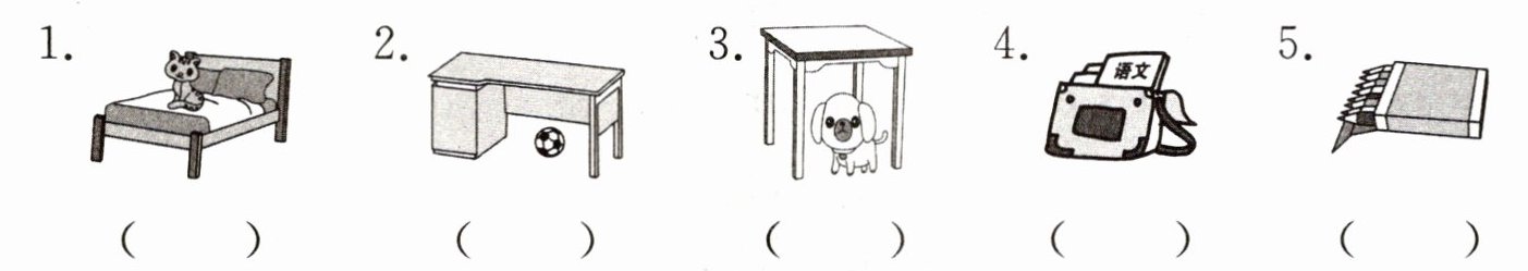 二、Amy 房间里有什么?它们的位置是怎样的?听句子,判断下列图片与你所听到的内容是否相符,相符的画“√”,不相符的画“×”。