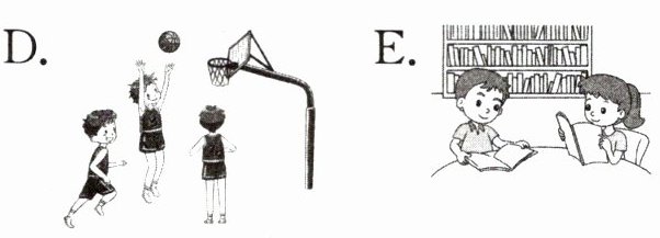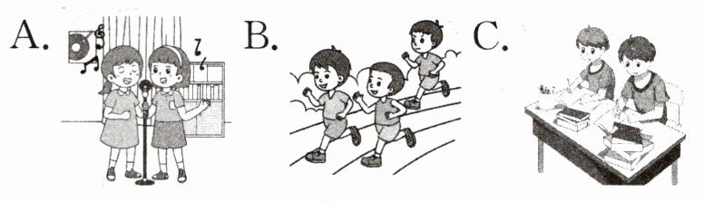 四、Emma 她们所在的新学校真大,同学们常常在学校里开展各种各样的活动。请给下列句子选择相符的图片。