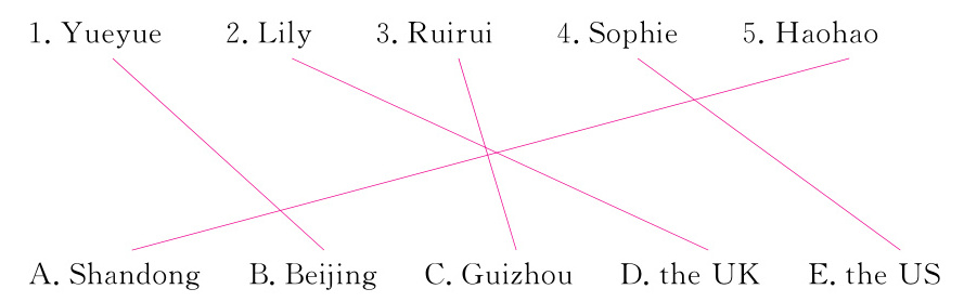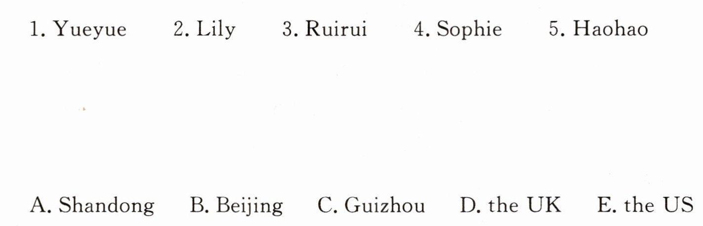 二、妙妙在英语角认识了来自各地的新朋友。听句子或对话,将人物与其家乡连线。