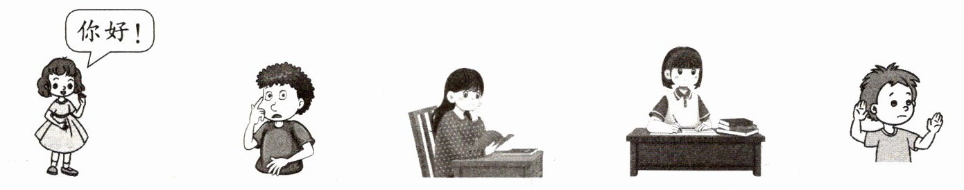 三、吴老师会根据课堂实际情况发出适合的指令指导同学们学习。听句子,用数字 1—5 给下列图片排序。