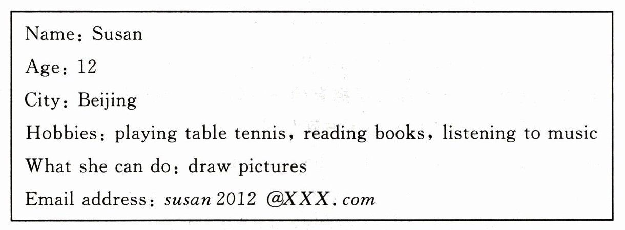 七、假设 Susan 是你的笔友,请根据她的信息卡片,写一篇短文来介绍她。