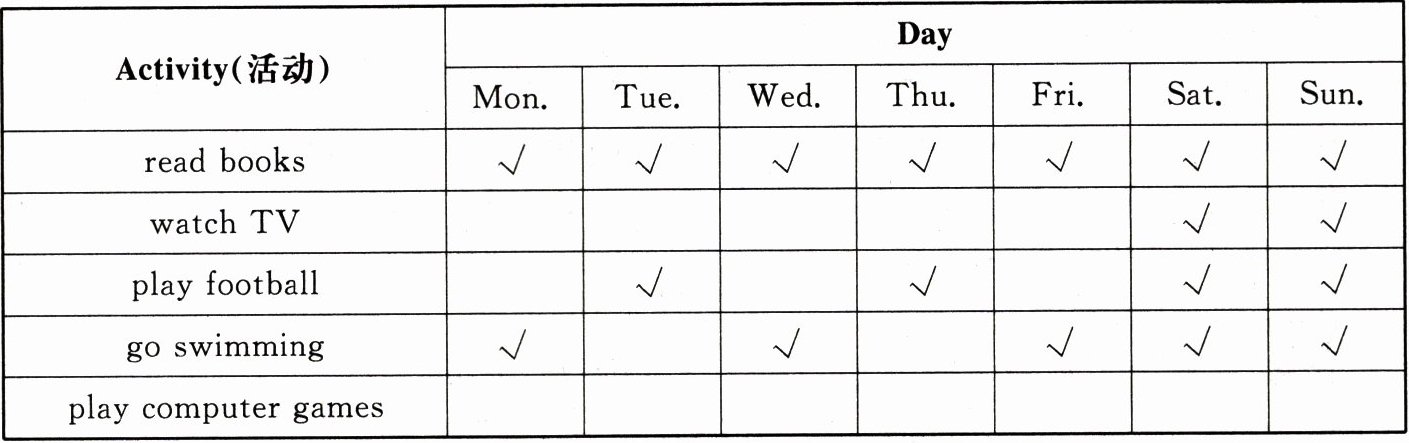 二、Cindy 将她一周内开展课余活动的情况整理成了表格。请根据表格,选词填空。