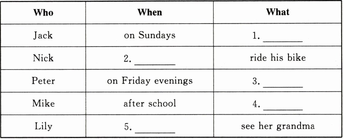 一、Jack 和他的朋友们平时会做什么呢?听句子,选择正确的选项补全表格。