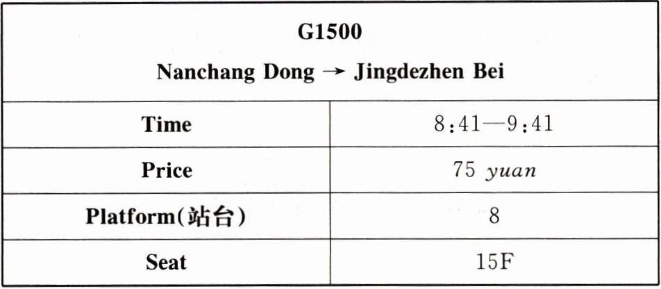 )3. It will take Lucy one hour to get to Jingdezhen by train.(