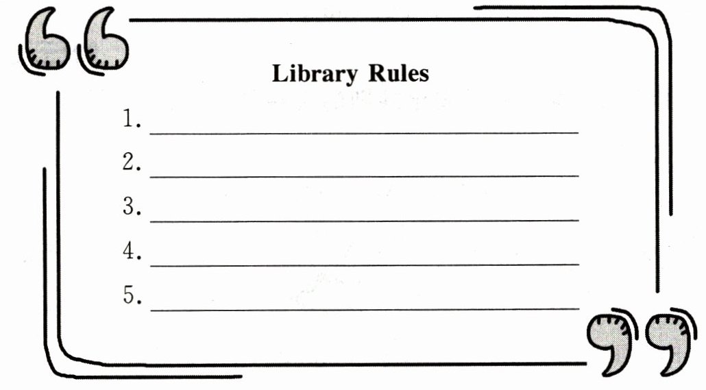 五、学校图书馆正在举办“我是文明小读者”活动,鼓励同学们制作图书馆的文明守则卡片。Tina也报名参加了,请帮她写几条图书馆的文明守则。