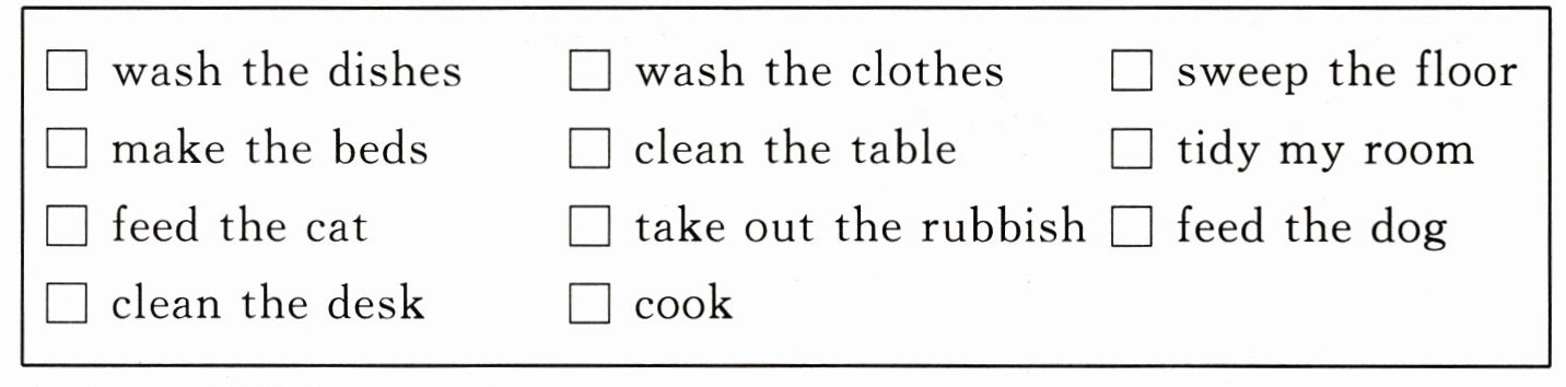 任务一:□ wash the dishes √ □ wash the clothes □ √ sweep the floor √ □ make the beds √ □ clean the table √ □ tidy my room √ □ feed the cat √ □ take out the rubbish □ feed the dog □ clean the desk □ cook