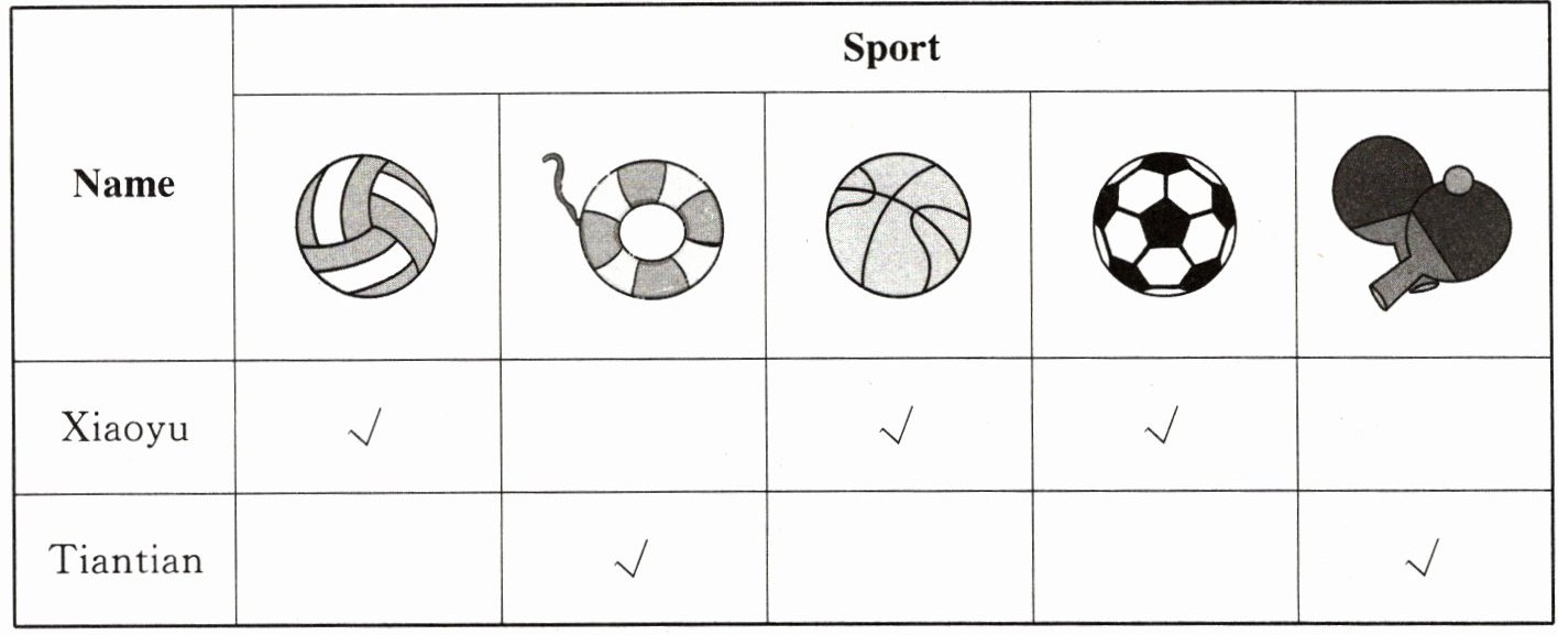 四、小雨和甜甜分别擅长什么运动?请根据表格,完成下列任务。