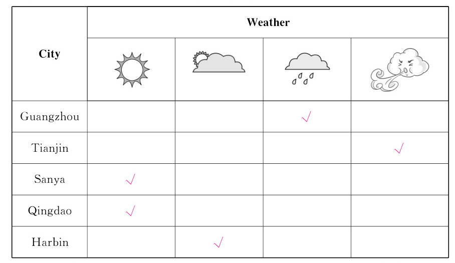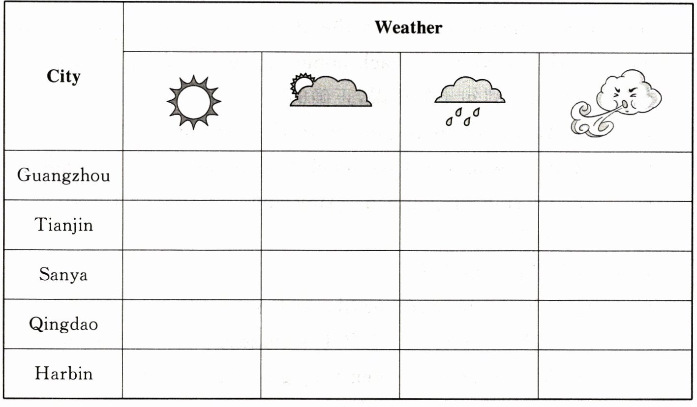 二、大明一家计划假期去旅游,他们正在了解各个城市的天气情况。听对话,选择每个城市对应的天气,画“√”。