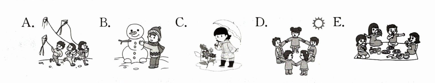 三、不同的天气可以带来不同的快乐,因为我们可以做不同的事情。请给下列句子选择对应的图片。