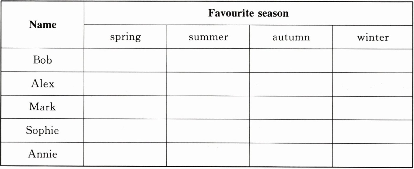 任务一:Bob:winter√;Alex:spring√;Mark:autumn√;Sophie:autumn√;Annie:summer√。任务二:1. T 2. F 3. T