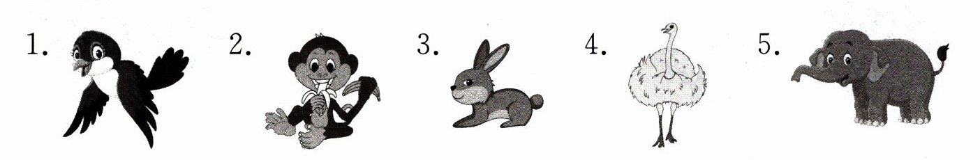 Hi,everyone! We are so happy today! The pandas are cute. They like to eat bamboo (竹子). They can play volleyball. The monkeys are clever (聪明的). They can climb the trees. The elephants are big and strong. They have got long noses and big ears. They can drink water with their noses. The tiger can run fast. The ostrich can run fast,too. Who runs faster (更快的)? Is it the tiger? No,it’s the ostrich. She is the winner (获胜者)!