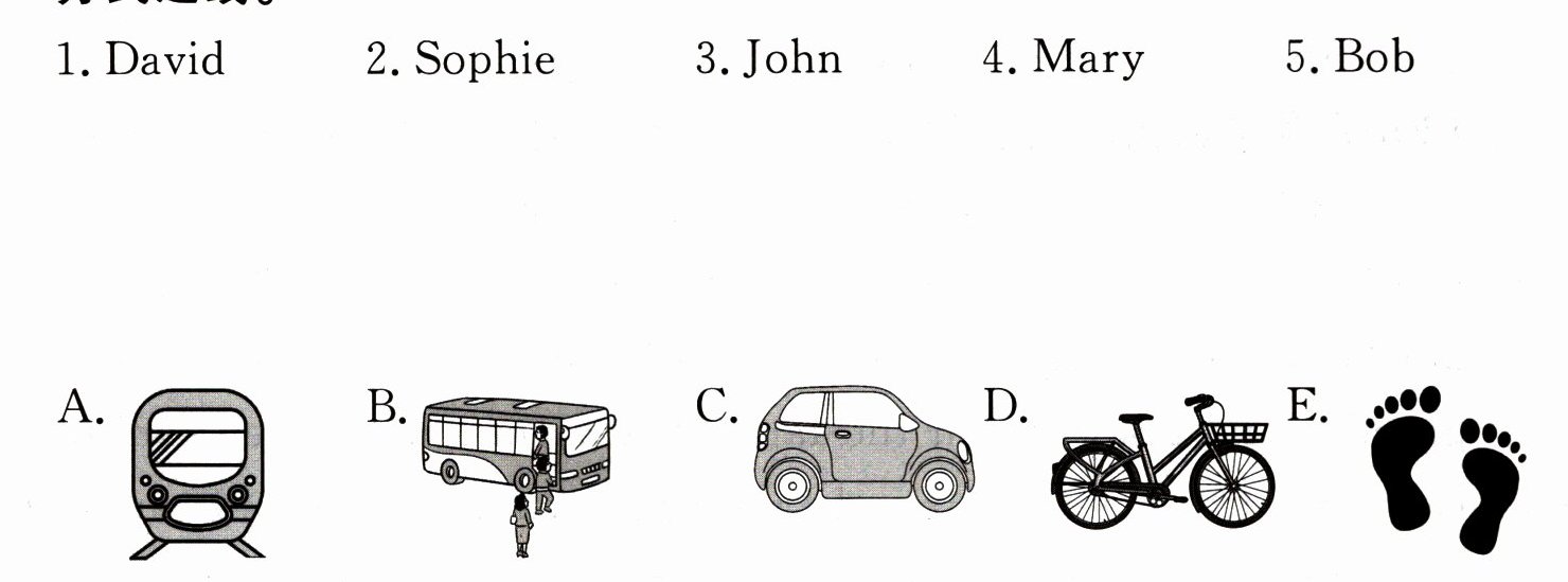 一、Sam 在调查班上同学上学的出行方式。听句子,将姓名与对应的出行方式连线。