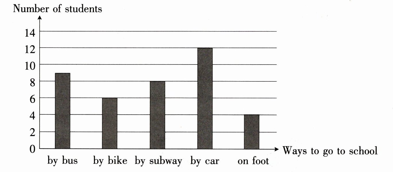 三、Sam 将调查结果整理成了条形统计图。请根据统计图,填单词,补全句子。(每空一词,注意使用单词的正确形式)